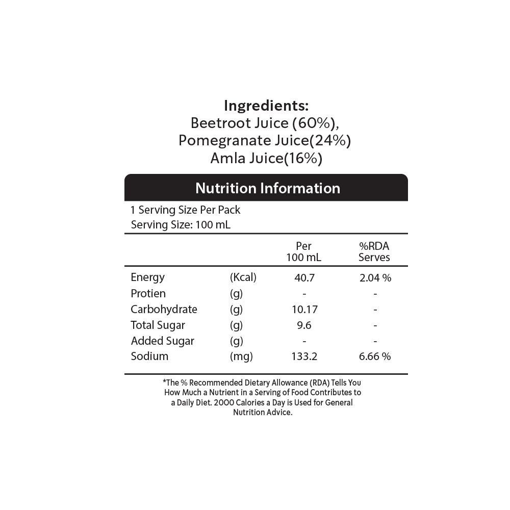 Glow Up Shot is designed to enhance your natural radiance and energize your body. Experience a burst of freshness and sparkle with every moment. Ingredients: Beetroot juice(60%), Pomegranate Juice(24%), Amla Juice (16%)